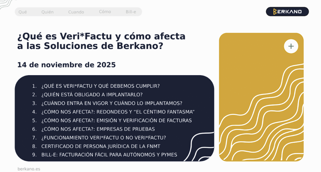 Con el título: ¿Qué es Veri*Factu? ¿Cómo afecta a las soluciones de Berkano? llevamos a cabo este seminario, donde explicamos cómo este reglamento de obligado cumplimiento afecta a nuestras soluciones bOSS.